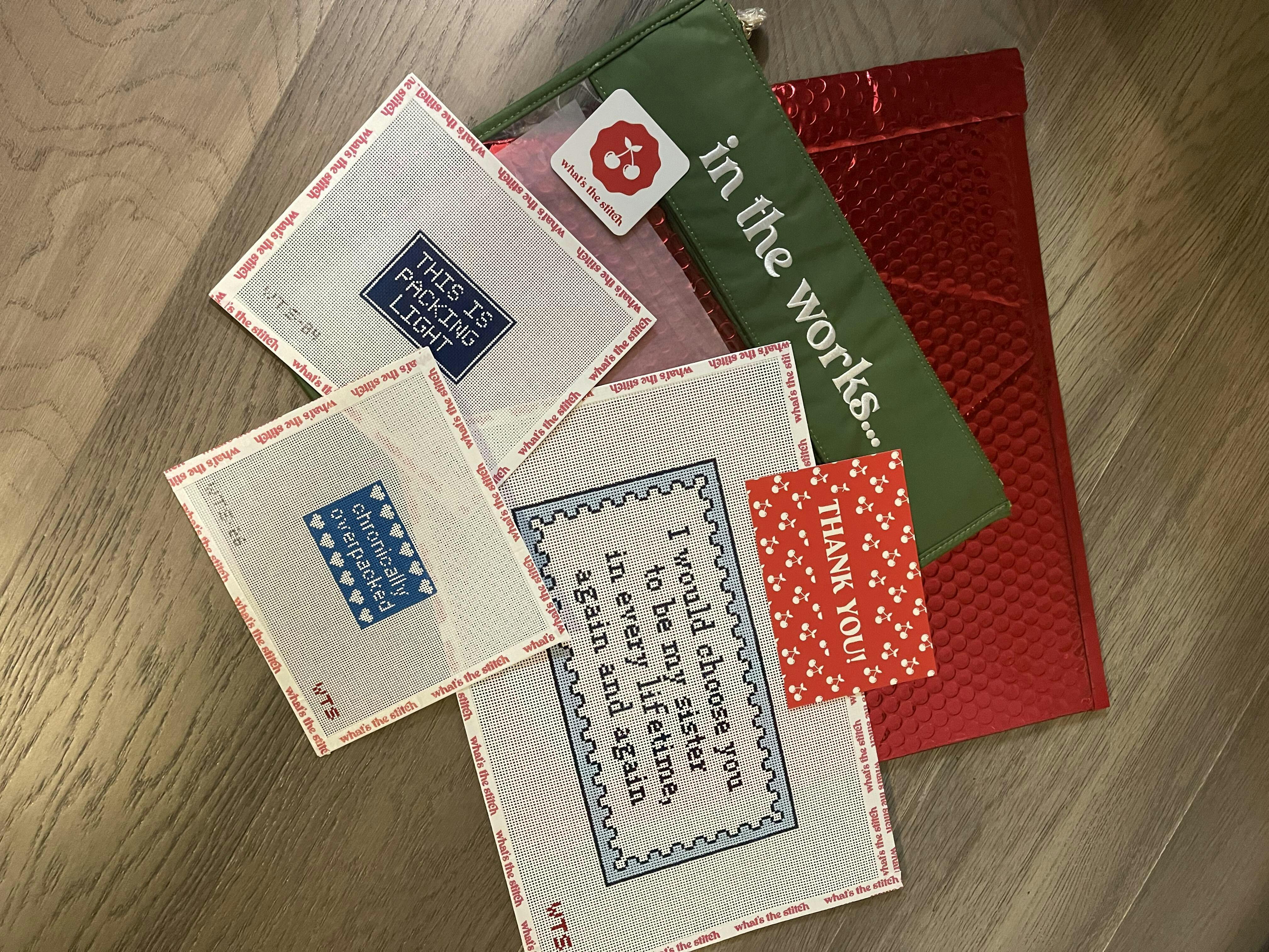 What's The Stitch needlepoint project, hand-painted canvas ships ready to stitch.