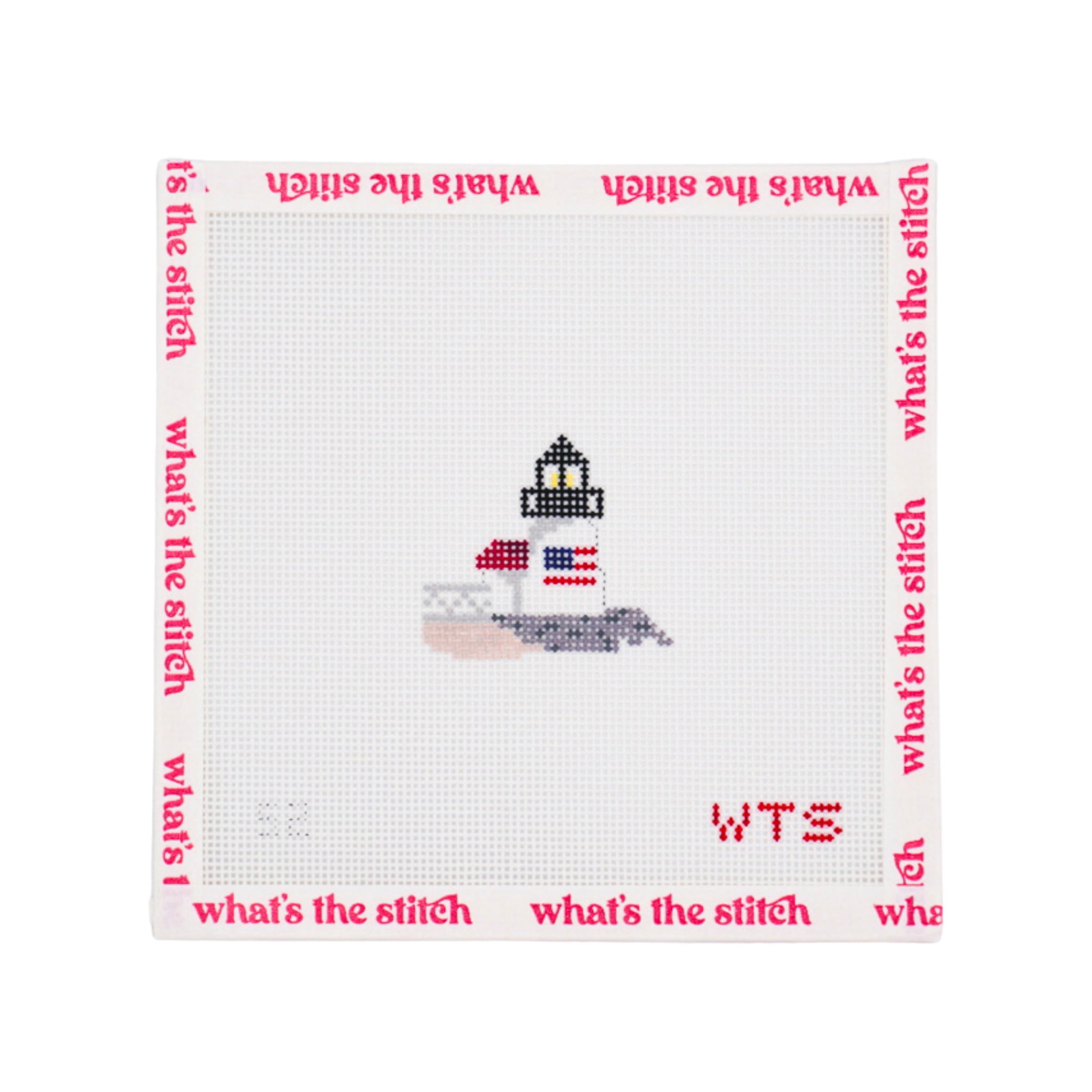 What's The Stitch needlepoint project, hand-painted canvas ships ready to stitch.