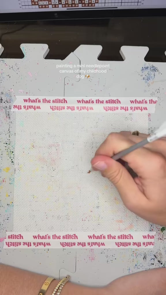 What's The Stitch needlepoint project, hand-painted canvas ships ready to stitch.